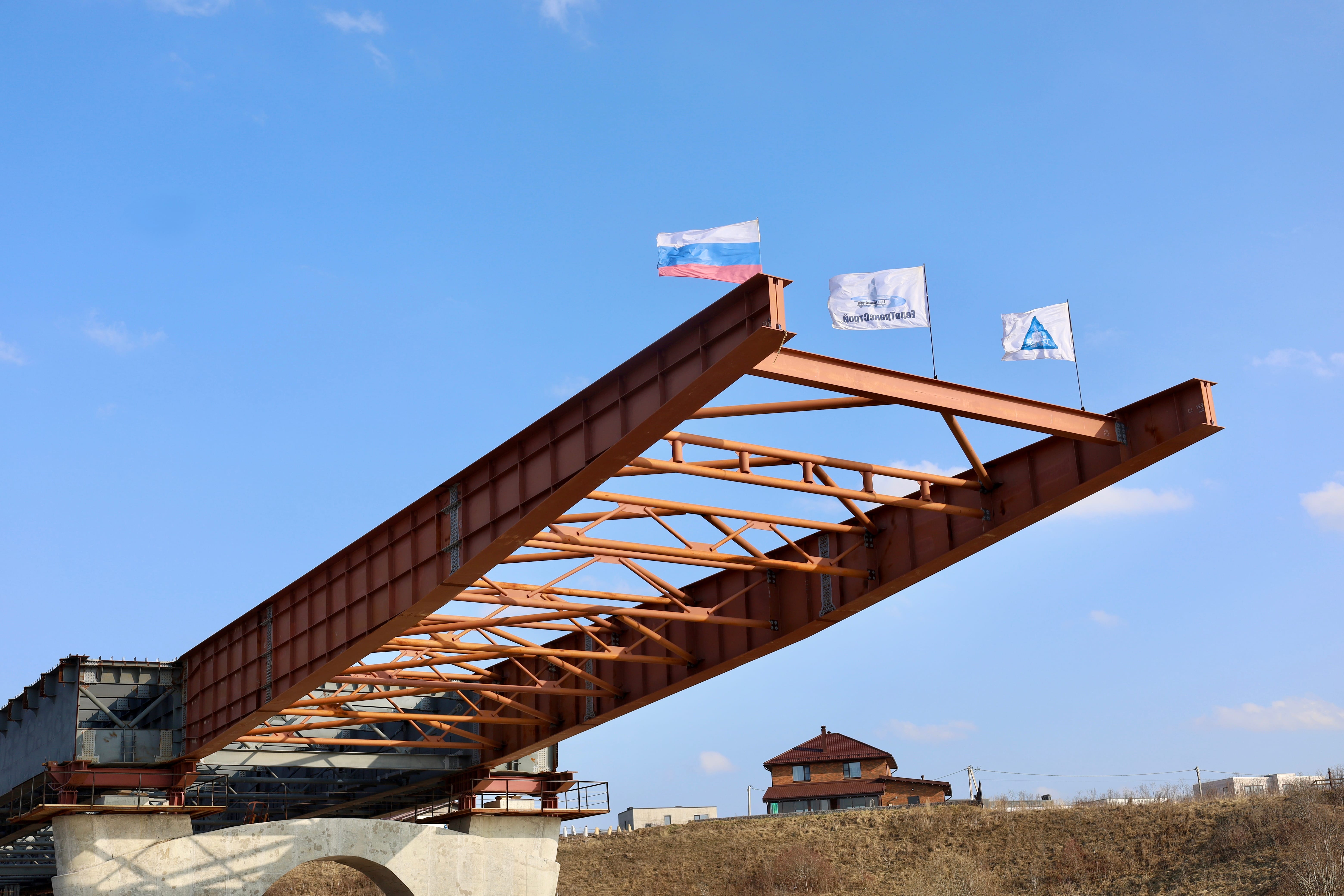 Параллельно на берегу со стороны деревни Хотицы идет сборка металлического пролетного строения, которое надвигается гидравлическими домкратами на опоры в русле реки. Уже готово 150 пог. м пролетного строения. Современная технология надвижки сокращает сроки монтажа примерно на 40 % по сравнению с другими методами и повышает точность установки. Полностью завершить этот этап планируется до конца года.
